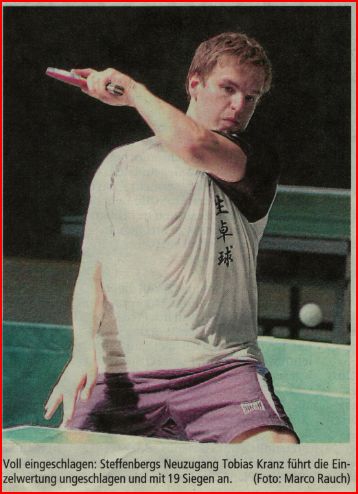 Mit dem Spitzenspieler Tobias Kranz, der ungeschlagen ist und eine Bilanz von 19 Siegen spielt ist Steffenberg 1 dem Ziel des sofortigen wieder Aufstiegs schon sehr nahe.